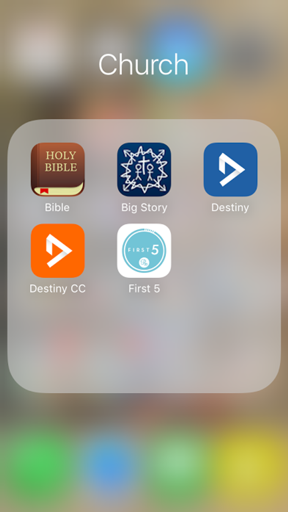The first folder is the folder I called "Church". This folder has 5 apps in it: YouVersion's Bible App, InterVarsity's Big Story app, my church's app, my church's Community Center app, and a devotional app called First 5.
