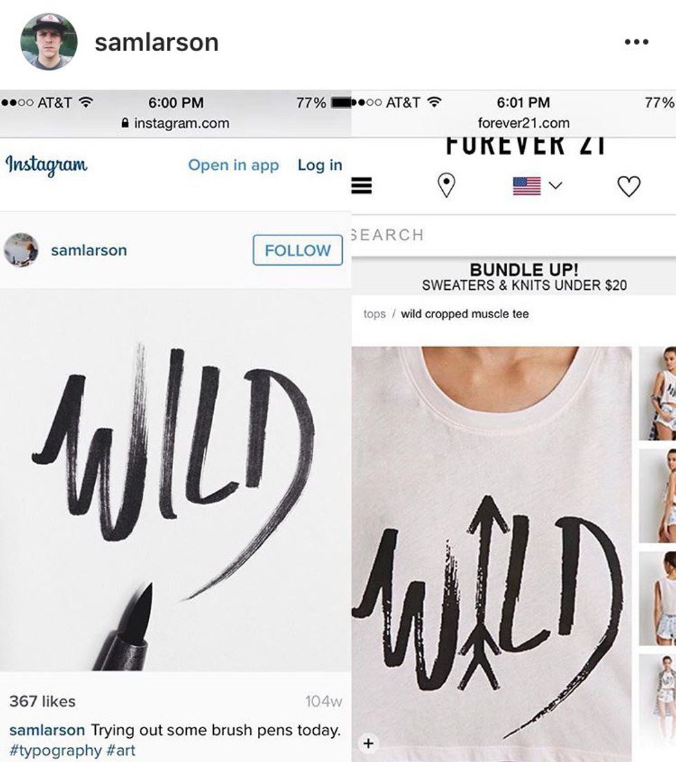 Zara is certainly not the only large fashion brand whose obviously plagiarized and sometimes poorly reproduced versions of small artists’ designs have been exposed in recent years. Forever 21, the American fashion retailer that brings in over $4 billion in sales yearly, is a repeat offender. In 2013, Forever 21 released a men’s shirt featuring an image of a figure looking up at an etched mountain, reading “You can conquer anything” — an illustration which artist Kelly Bastow had posted on her Tumblr account the year before. When Bastow contacted Forever 21’s complaint center, the retailer was quick to blame their vendors, stating that the “tee was purchased from a third party vendor.” New York artist Jon Contino experienced a similar case in 2012, when a friend sent him a photo of a Forever 21 tank top featuring a very familiar anchor design, which was quickly removed from the store’s website. Also among Forever 21’s accusers is Sam Larson, a freelance artist from Portland, Oregon whose Instagram post of a crop top featuring his art caused an outpour of tweets under the hashtag “#paysamlarson.Urban Outfitters is also notorious for art theft, as full-time Etsy jewelry seller Stevie Koerner found out in 2011 when replicas of her “A World Of Love” state pendants began popping up in Urban Outfitters stores. Urban responded by claiming that the fact that so many identical pieces exist on Etsy proves that “the idea is not unique to Koerner and she can in no way claim to be its originator.” Three years later, James Soares, who sells art prints on the website Society6, claimed on his Tumblr account that one of his original patterns had been ripped off and sold on a miniskirt at Urban Outfitters (another claim that was met by the piece in question being removed almost immediately from the brand’s website.) The social media attention these and a number of other cases have brought to Urban Outfitters’ plagiarizing tendency inspired the creation of the Tumblr account Boycott Urban Outfitters, and a popular hashtag of the same name, dedicated to exposing the company’s art theft and encouraging readers not to shop there. In an age where every lie, cover up, or false move can be quickly unearthed and spread by social media detectives, it is no surprise that large clothing brands are having a hard time getting away with blatantly ripping off designs without sparking internet outrage, news stories, celebrity statements, and even the creation of a website entirely dedicated to raising awareness of and supporting arts affected by art theft, started by an artist whose drawings have been stolen from the retailer in the past.