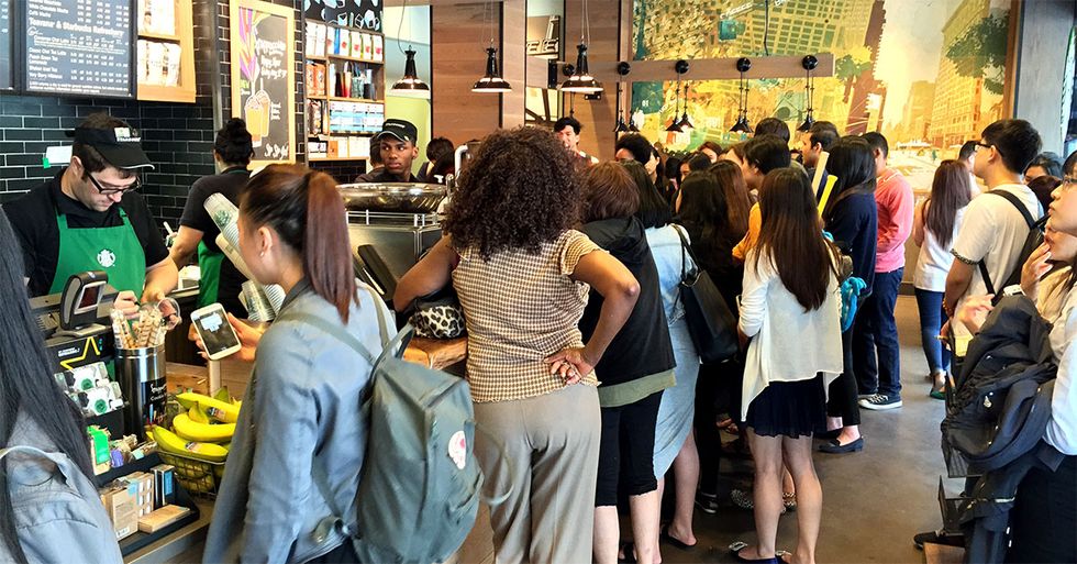 Picking up the pace of walking is one thing to adjust to, but the over all state of mind of New Yorkers are quicker pace too. Punctuality is key in the city. You need X amount of time for transportation whether it be subway, cab, bike, bus, or walking. You need X amount of time TO EAT, which is why $1 pizza is amazing and in fact a thing. Also, the lines for ANY Starbucks will be at least this long, and also for their bathrooms.