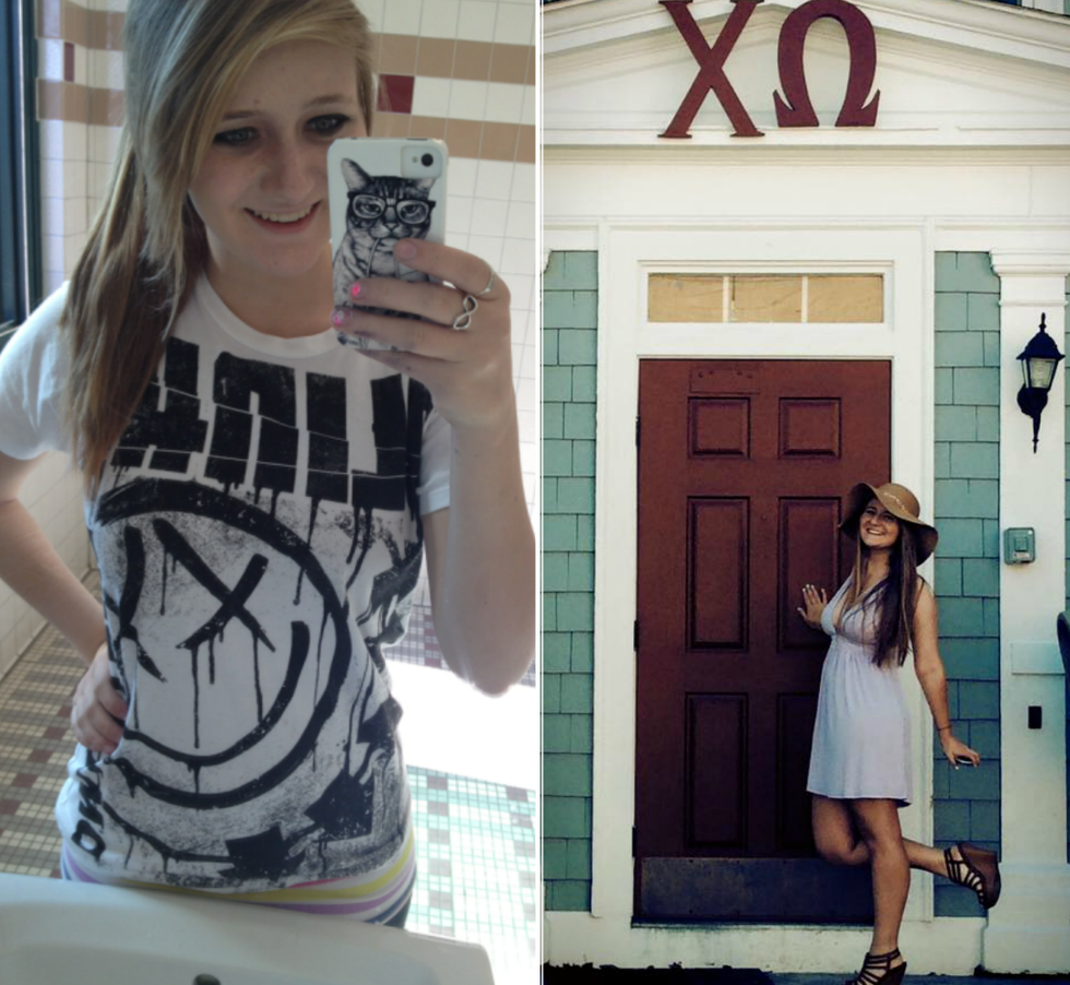 So picture this; my 15-year-old self, sitting in my bedroom covered in band posters and song lyrics, wearing some ratty old converse and listening to A Day to Remember while turning myself into a raccoon with 99¢ eyeliner, even though my bangs completely covered one of my eyes and sometimes almost both. You’re gonna tell this perpetually angry-at-the-world girl that in 3 years she’s gonna be sporting a Chi Omega spirit jersey with Lilly Pulitzer patterned letters? (To be fair, I’m still nearly certain that wearing anything Lilly Pulitzer would cause me to break out into hives and the only exception is when it’s the Chi Omega print, but even that's risky).