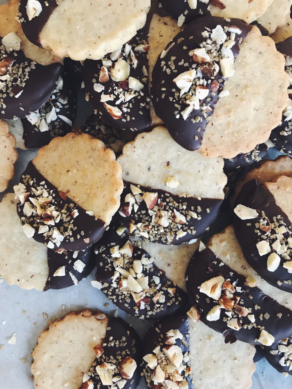 By incorporating toasted hazelnuts into the batter, this shortbread has a signature snap. Dipped in hot semi-sweet chocolate, the flavor options double into a salty-sweet combination. The topping of gold sprinkles mimics the star that sits atop the tree in an enticing finish.