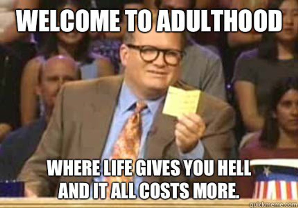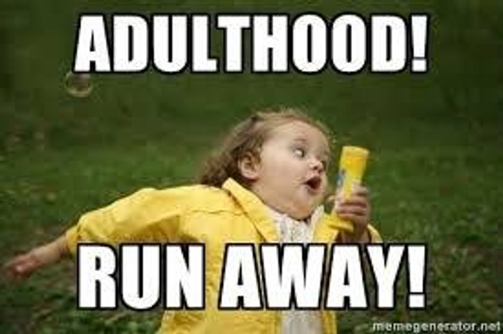 Going into adulthood is way too hard because you have to basically teach yourself how to be an adult. If you don't know how to do your own laundry, which most of us still don't, then you have to teach yourself and it really sucks. All of these things that categorize us as an adult are just crap because there is no real age that says that you can take care of yourself, only you can be the judge of that. Trying to be an adult is very difficult and I am not quite sure when I will be ready to "adult" but I know it isn't now and I really don't consider myself an adult and I think that no one will ever be ready to dive into the trap that is adulthood.