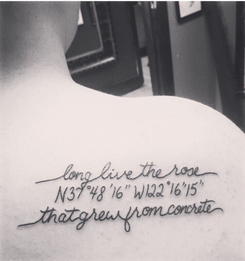 It felt like that was my sign to understand that Connor's death had the ability to bring some sort of good into this world. If just one person could learn from Connor's mistake, then maybe they could regain their life and potentially inspire someone else to fight back against addiction. As hard of a pill as that was to swallow, I had to swallow it for my own sanity. And I still honored Connor in my own special ways. For starters, I got a Tupac tattoo - complete with the GPS coordinates for Oakland, California (the place where I think he felt the most at home).