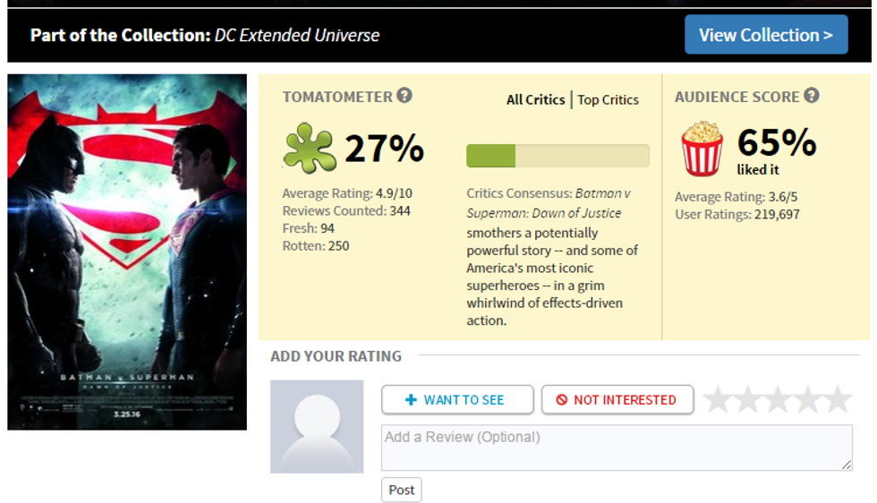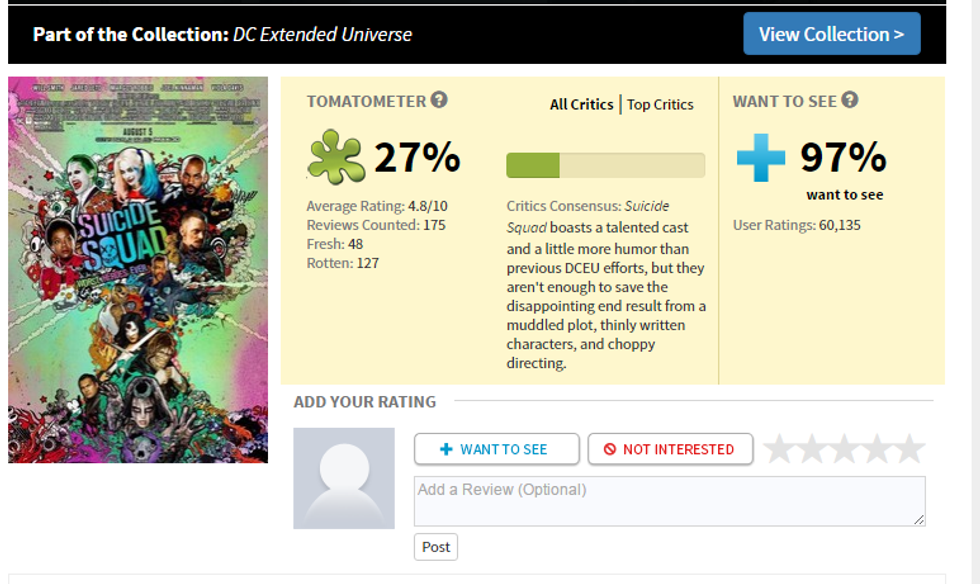 Reviews have been way off for "Suicide Squad." In fact, Rotten Tomatoes has granted it the exact same score "Batman v. Superman" has, a lackluster 27%.