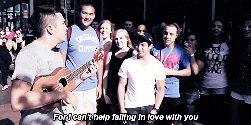 "I asked my crush out to prom by rewriting the lyrics from "Can't Help Falling In Love" by Elvis (They all say, only guys ask girls. But I can't help asking you to the prom.), got two of my friends to to play the ukulele behind me while I sang to him and held a sign that said "Prom?" With check boxes that said yes or no."