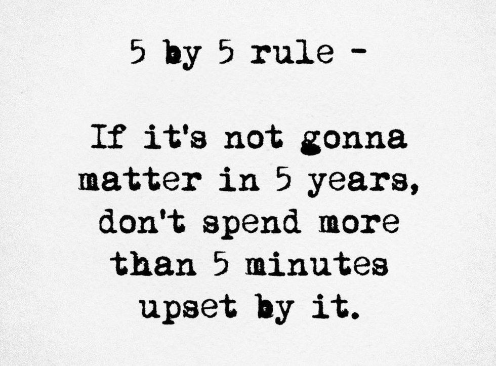 I hold grudges pretty badly and I have to ask myself "Is this worth staying mad about?" 99.9% of the time I say yes it is and I stay mad. Recently though I had found this post on Twitter that had said "5 by 5 rule- If it's not gonna matter in 5 years, don't spend more than 5 minutes upset by it."