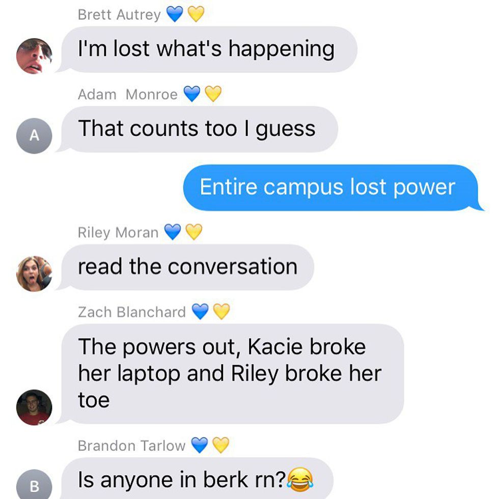 The emergency hallway lights were on, and there were a few girls standing in the hallway, letting out their frustration and confusion over losing power. Immediately my phone started going off, and one of the group chats I am in went crazy.