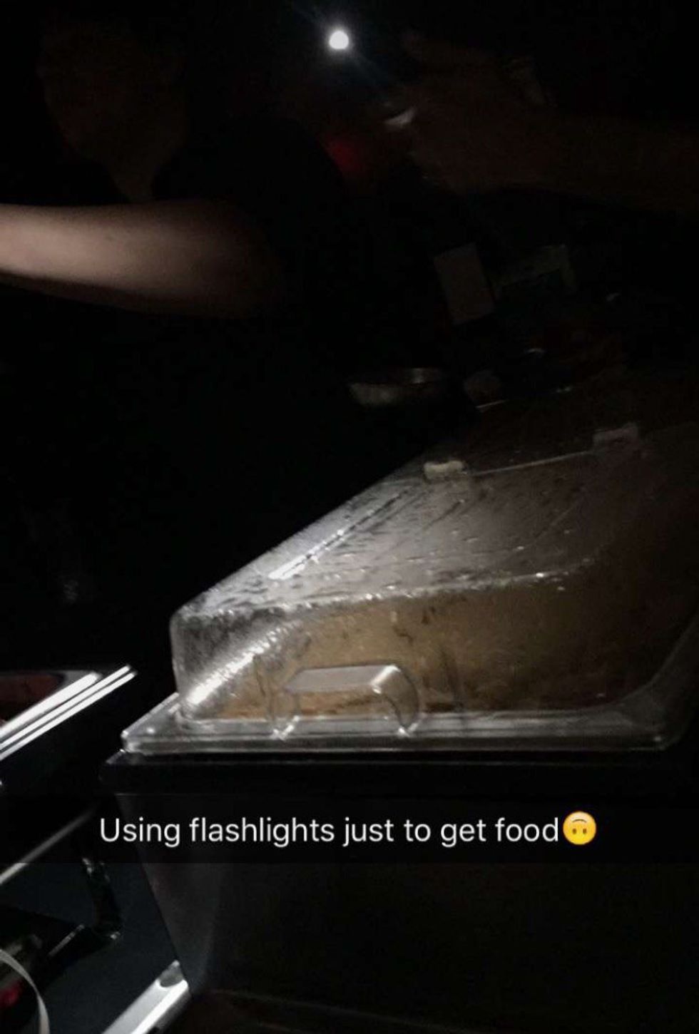 My friend, Riley, and I decided to go get dinner at the dining hall, before they ran out of food. The dining hall itself had no power, but they were still serving the food that they prepared for the dinner wave. We were warned that once it was out, it was out, and we should get to it as soon as we could. Riley and I had to use our phone's flashlights in order to get food, and we got a good couple laughs from the staff as well. We managed to get room temperature pasta, with sauce that was being heated by those gas burners you put under serving trays. As soon as we got food on our plates, the staff began running around and replaced the everyday plates with paper plates and plastic cups and silverware.
