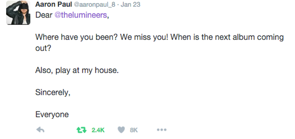 So come on, Lumineers! We are here stuck singing "ho hey ho hey" all night long, and you are off composing music for Jennifer Lawrence to sing?! We could have at least forgiven you if you were off composing music for Beyonce, but Jennifer Lawrence? Really? You’re killing us over here. Aaron Paul is weeping.
