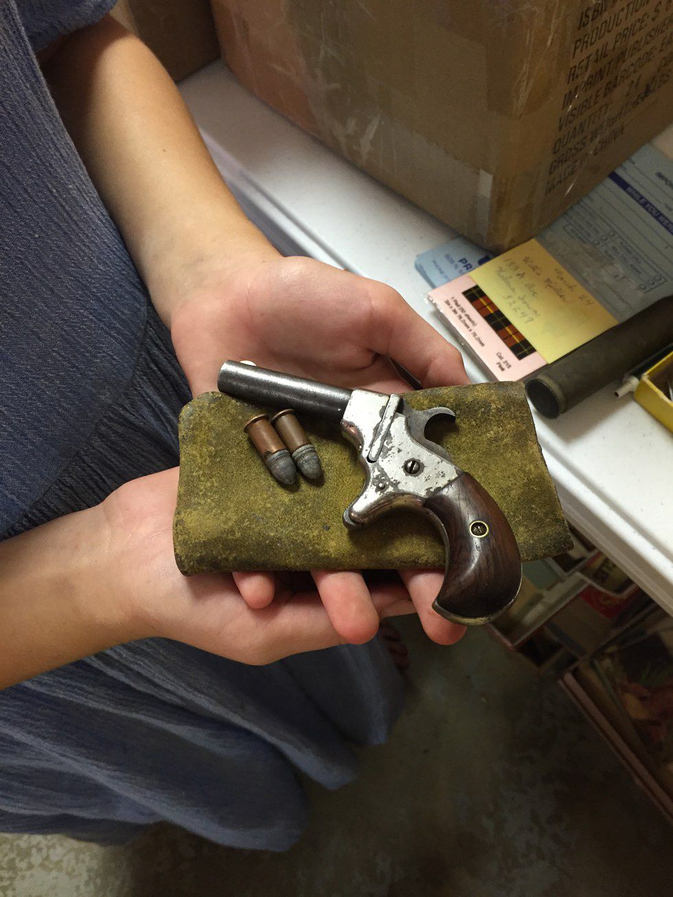 A 20mm, probably World War II vintage, bullet lay next to a tiny leather pouch, the glossy tan hide worn by years of use. I picked up the pouch, and pulled out a tiny pistol, the barrel shining, the faux wooden handle still smooth and polished. The bullet was longer than the pistol, and I wondered how to fire a weapon that small.