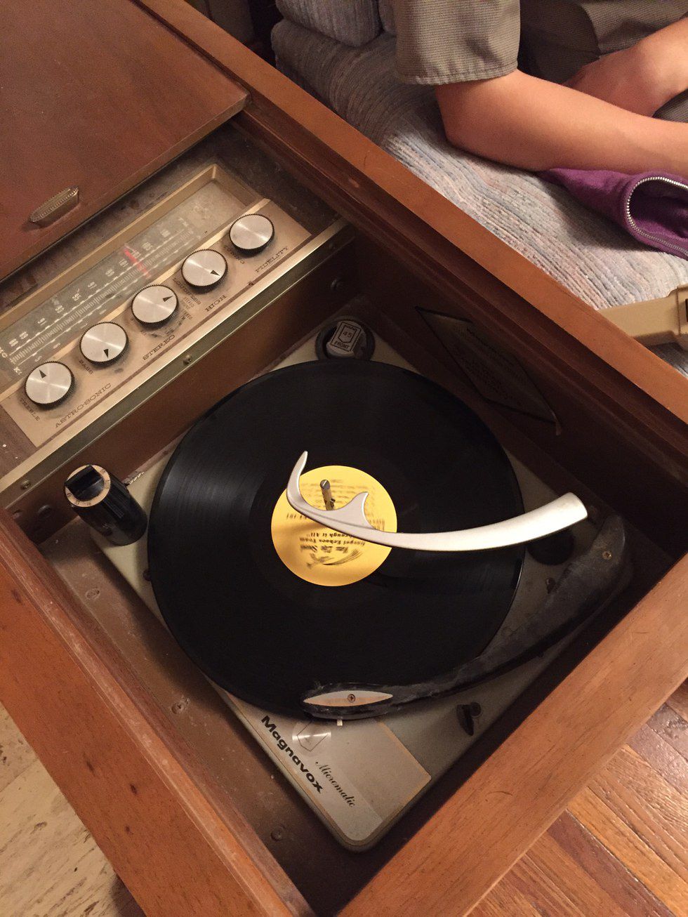We tried the cabinet record player, dropping a record onto the control arm, which dropped it onto the turntable. The needle moved over, and as my brother adjusted one of the knobs, the record wobbled out the voices of an old Mennonite group: the Gospel Echoes.