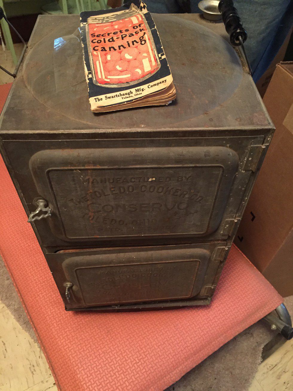 We found an old stovetop Conservo canner, with instructions on how to use it. We found tiny spoons and a fork, blackened with age. We found salt and pepper shakers of every size and description.