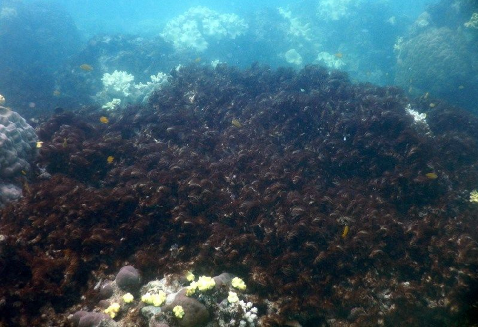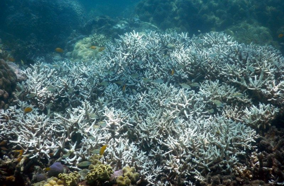 Coral bleaching occurs due to the temperature changes in the ocean water, which can occur due to El Niño and global warming, which then leads to a certain type of algae, zooxanthellae, to stop producing nutrients for the coral. When this happens, coral looks like this: