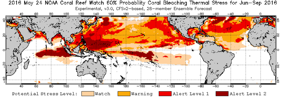 This map shows which areas in the world most affected by this. As you can see, mostly islands are surrounded by the darker color, suggesting that the possibility of coral bleaching is highly likely there. This is an issue because many fish call coral reefs home; most famously, Pixar's little fish Nemo. If coral reefs die out, how are we ever going to be able to find Nemo ever again? If this does happen, an ecosystem will be knocked out, which will lead to the people living on these islands to loose part of their diet and possibly some jobs.