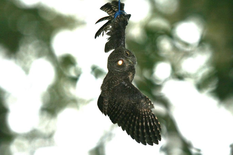 (Above: A screech owl caught hanging from a balloon ribbon.)