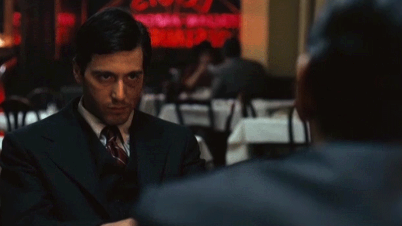 Michael giving his signature cold stare before his milestone murder, officially involving himself into the family business