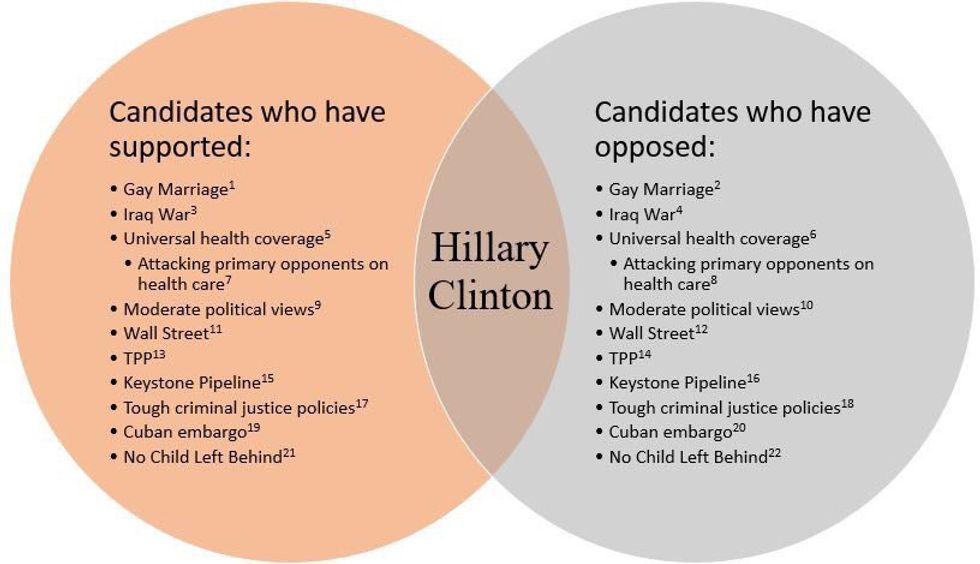 Hillary Clinton is attacked as being a calculated politician; one that doesn't go with her gut, but one that is swayed by what people want to hear at any given point. With her running for president, it has only become more prominent. She must appeal to voters of all kinds and minorities, LGBTQ, black, Latino, young women and white men, to gain the democratic nomination, so she is now tailoring her message and adjusting her stances to align with those voters and people have taken notice.