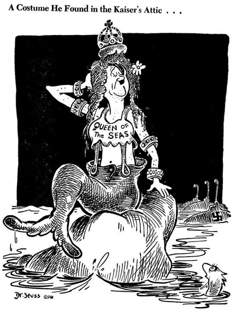 According to an excellent biography by Judith and Neil Morgan, Geisel worked for an obscure Democratic newspaper called "PM" during the beginning of the Second World War. He made political cartoons in his classic Seussian style. He held nothing back in his work, willing to call a Senator a horse’s ass and harshly depicted isolationists as idiots who were opening the door to the apocalypse. Even Hitler was not off limits for the cartoonist. In his cartoons, Hitler was depicted a naughty and cruel moron pulling silly pranks and going on mischievous adventures. In one cartoon, Hitler is a baby burning the foot of the stork delivering him. In another, he plays a doctor looking over the body of an ill-looking character representing Japan. And in another, Hitler dresses in a mermaid costume he found “in the Kaiser’s attic.” There were lot more of Hitler’s Seussian antics shattered throughout the pages of "PM" and you should see them for yourself. I'll bet that you won't be able to help but crack a smile or two while you wonder why did Dr. Seuss felt it was okay to portray one of history’s most evil mass murders with such cartoonish spirit