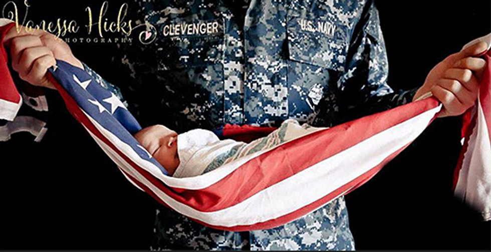 A literal soldier, holding a literal baby in a literal flag. But disrespect to the American Flag is okay when it's "cute."