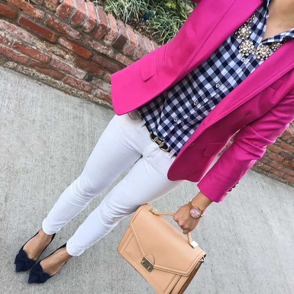 A fancier look paired with a button-down, a blazer, a statement necklace, and heels. The white lays down a great base for other pops of color to come through and can obviously be dressed up to fit a fancier vibe.