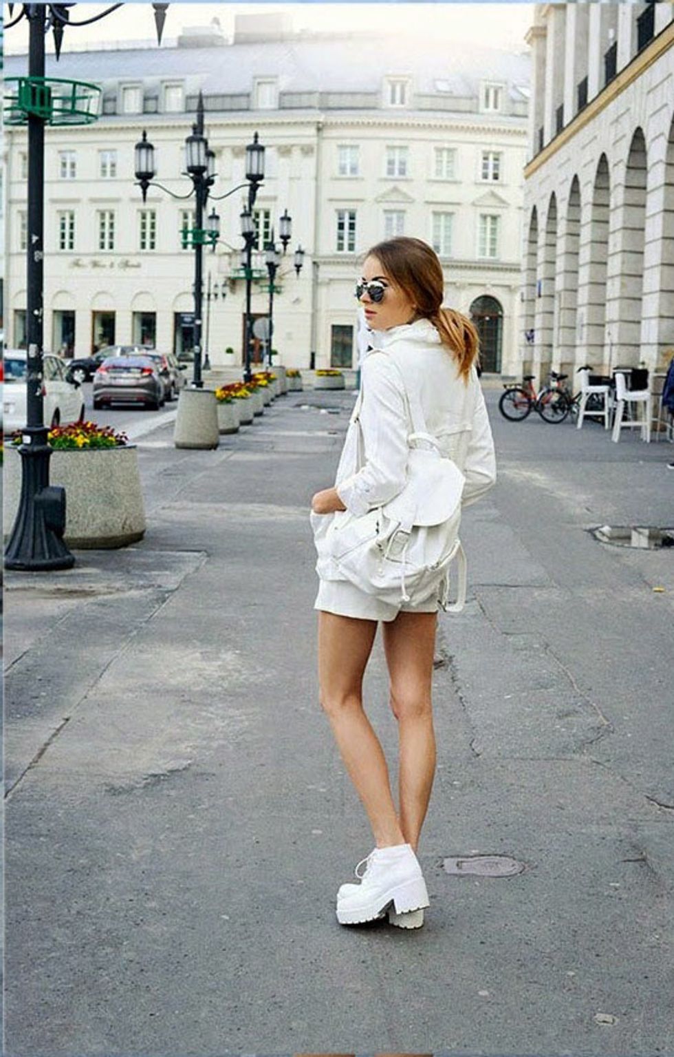 When working out or just lounging around, white athletic shorts or a tennis skirt and sneakers are summery and look great with bright colors.