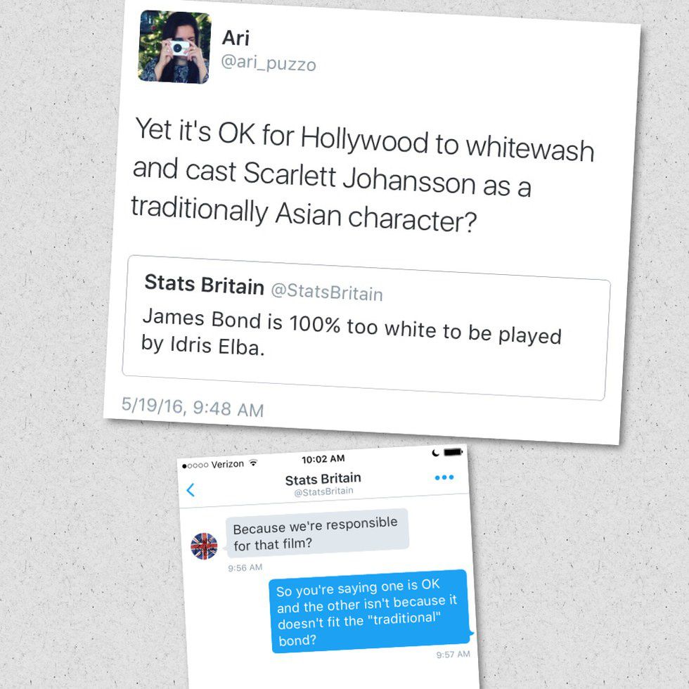 Nonetheless, there are still people who think that if whitewashing is wrong that the opposite (changing the race of a character who was traditionally depicted as white) should be considered wrong as well. However, that does not factor in how the latest discussion is exemplary of how white privilege operates in our culture. I brought that reality to the attention of a Twitter with the user handle @StatsBritain recently. Below is the progression of our conversation.
