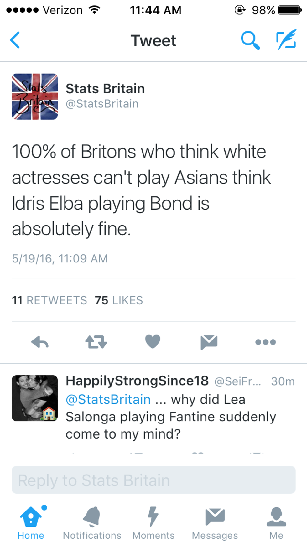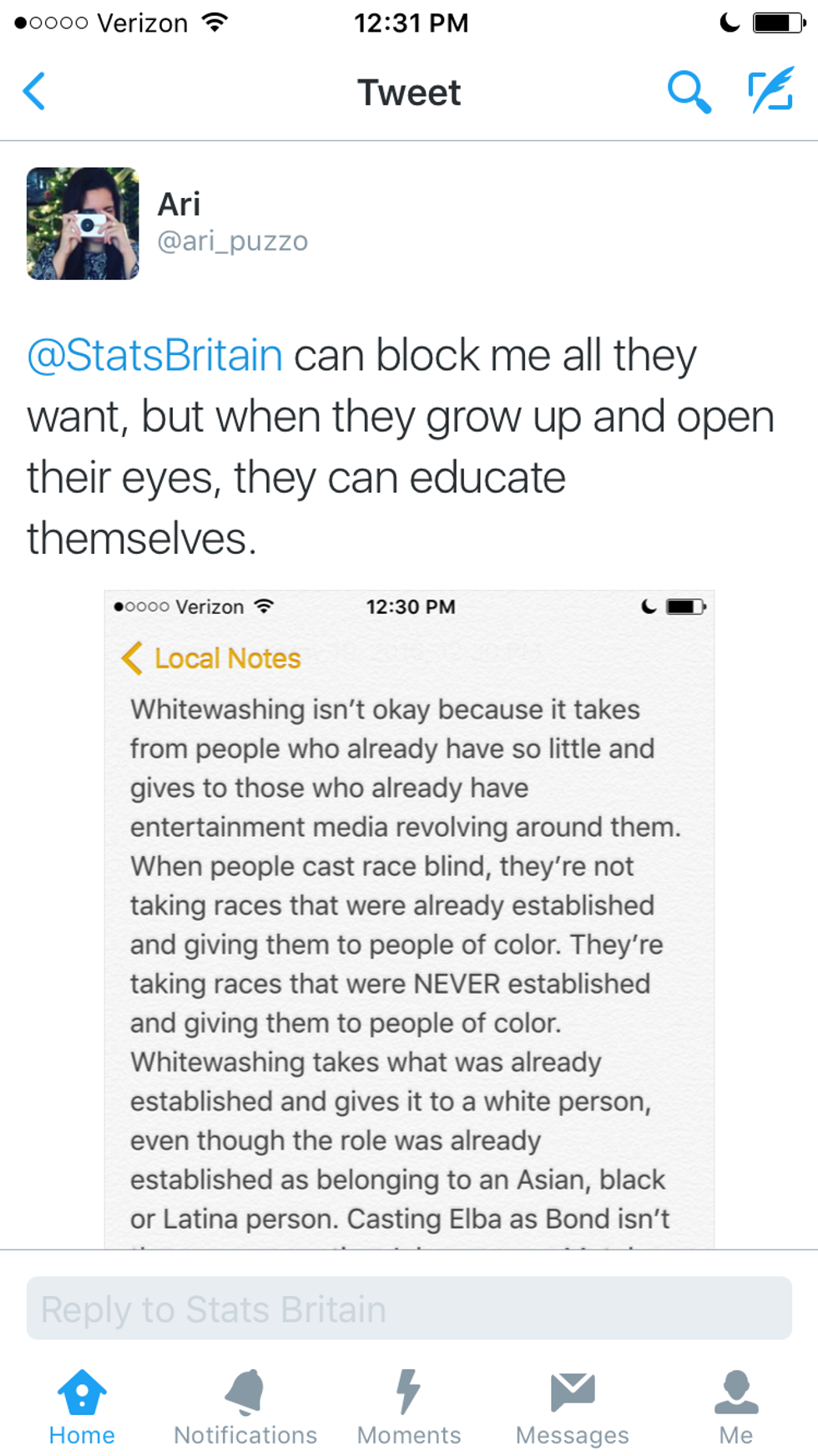 It not only amazes me that Stats Britain thinks their actions in blocking me are justifiable, but more so that they are unwilling and unable to comprehend that one example of a character is not the same as the other because of the reality of particular opportunities that our culture and Hollywood has created for certain actors. The final tweet I sent to them was what another friend of mine sent to me regarding the entire experience. It touches upon the aspects of whitewashing that I mentioned above. Below is the full message she sent, as well as the tweet that I then sent to Stats Britain with her thoughts attached to it.