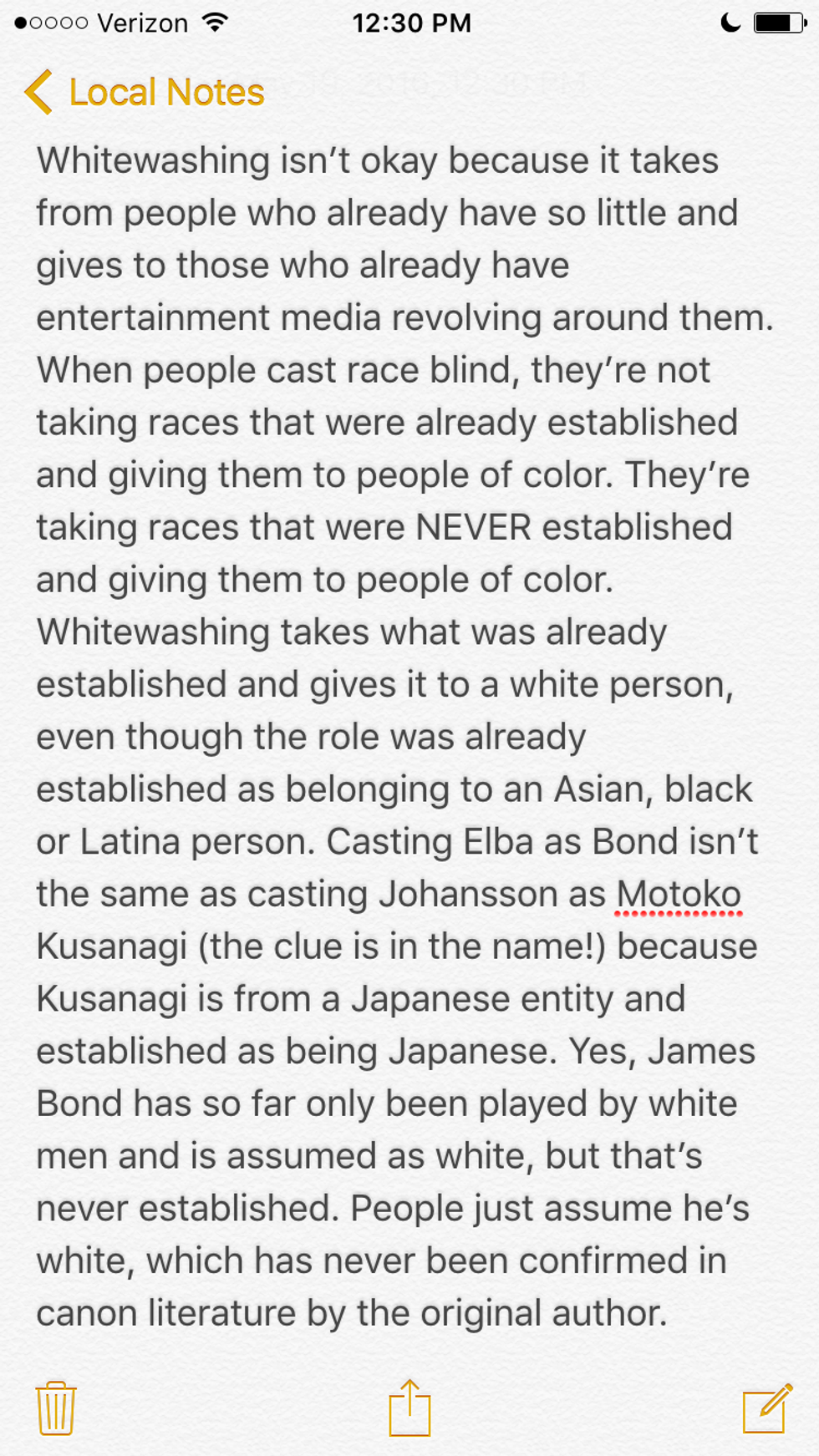 Therefore, to use a timely example, casting Scarlett Johansson – a white American actress – as Motoko Kusanagi, a distinctly Japanese character in the animation film “Ghost in the Shell,” is not the same as considering Idris Elba for the role of the next James Bond. While a white Englishman wrote Bond and may have had a particular image in mind, Ian Fleming never explicitly stated Bond’s race; it was assumed. These types of assumptions are where greater problems are generated and where greater limitations are set for creative interpretation that would enable more actors of color opportunities to portray roles that were not designated as a particular race.