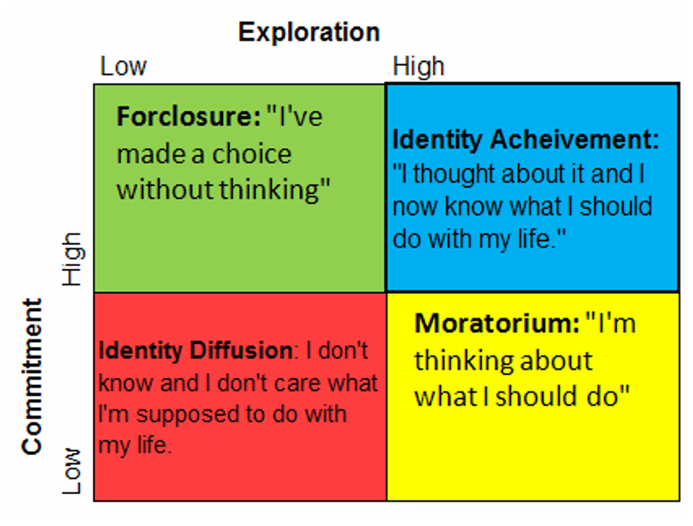 In the late to mid 1990's, the psychologist James Marcia created something known as the "Identity Status Theory". In this theory, Marcia depicts the stages and events that lead to the creation of what one could consider to be their "identity", or in other words, who they are as a person. There are four stages that people encounter in establishing their identity: