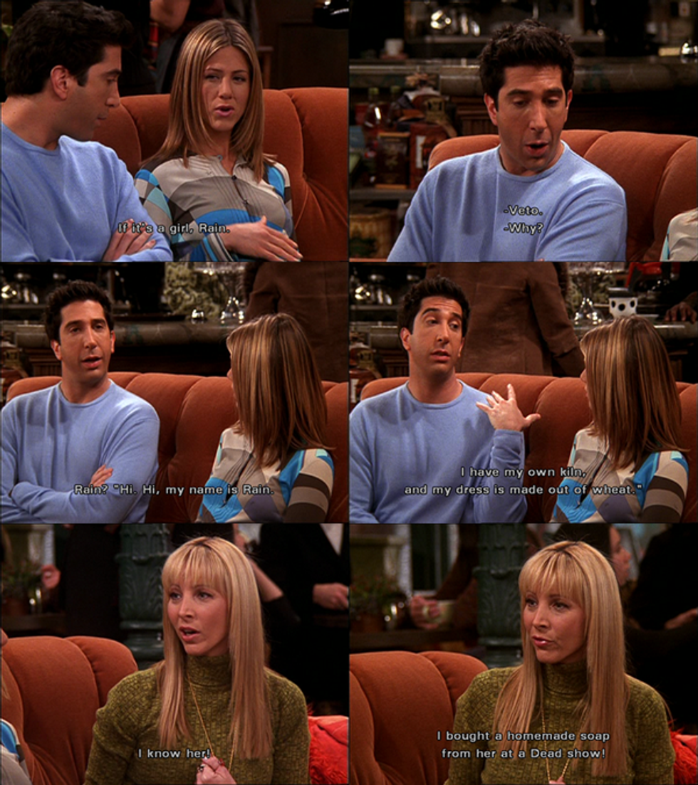 So have you ever seen that "Friends" episode where Ross and Rachel are discussing baby names? Rachel wants to name her Rain. Ross goes, "Hi my name is Rain. I have my own kiln, and my dress is made of wheat!"