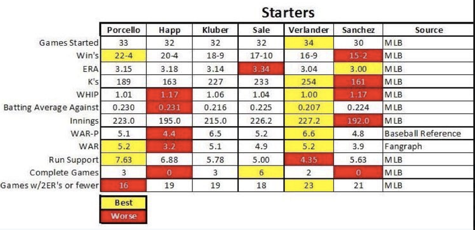With wins dominating the votes as the most important stat it is important to realize that Porcello also had the highest run support over 3 more runs per game than Verlander. Also a big part of why Porcello was awarded the Cy Young was because he allowed three or fewer earned runs in 27 of his 33 starts, while Verlander allowed 2 earned runs or fewer in 23 of his 34 starts a league best. Verlander also went 1-1 with (14 2/3 innings) giving up only 1 run and his ERA dropped from 3.21 to 3.04. The reason this is important because that stretch happened in the final week of the season where one of the voters, who left Verlander off his ballot had already submitted his votes. Besides the fact Verlander was left off of two ballots by writers their was no real question he had the best year in the American league. Porcello beat him in wins, but Verlander led the league in starts, strikeouts, WHIP, BAA, Innings, WAR-P, and tied Porcello in WAR. There should have been no doubt that Verlander had the best year, and most writers agreed with that because he had the most first place votes out of all the other contestants. The writers messed up on this one like in my opinion how when they picked Ryan Braun over Matt Kemp in the 2011 MVP race. Sadly, thats baseball writers will be influenced by team success and won't look at the numbers right in front of them. This is the second time Verlander has lost the Cy Young award by less than five points. Hopefully the writer's are held more accountable to award the most deserving player. This entrie rant is also coming from a Red Sox fan.