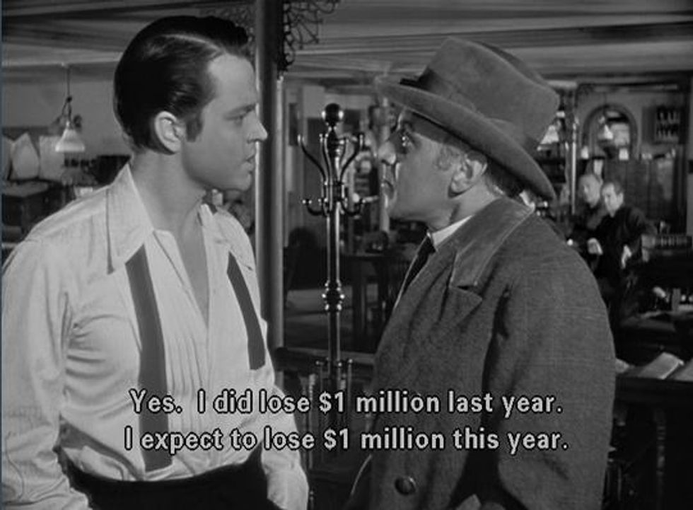 Although lonely, Kane was forced to grow up quickly leaving no room for him to fully mature. He was kicked out of several schools throughout his youth. Conceivably, this could be because he was an outcast or maybe it was his rebellious behavior and immaturity causing it. For someone so rich, getting kicked out shouldn’t be a problem. Finding another school or bribing the administration could be feasible solutions, but it goes to show that he was careless and immature. A normal person would be mindful of how they spent their money, but Kane did the contrary. Kane buys extravagant and expensive sculptures, art and fancy cars. These things will never be of any use to him. They will just sit and collect dust. Kane portrays that although he is an adult, he is still a kid when he says, “I think it will be fun to run a newspaper,” thus driving Thatcher mad with rage. The man is 25 years old and acting like a five-year -old boy at a candy store. In reality, he’s burdened with issues and an outrageous fortune, but he only desires one thing, a newspaper. Kane pays no mind to the words of wisdom and advice Thatcher gives him. In fact, he only responds back like a spoiled child when Thatcher warns him that the paper is causing him to lose money. Kane responds saying, “I did lose a million dollars last year. I expect to lose a million dollars this year. I expect to lose a million dollars next year. You know, Mr. Thatcher, at the rate of a million dollars a year, I'll have to close this place in... 60 years". If Kane valued his money, he would have invested elsewhere, doubling his fortune, rather than wasting it away, but it goes to show that Kane never really values money or the life it ha given him.
