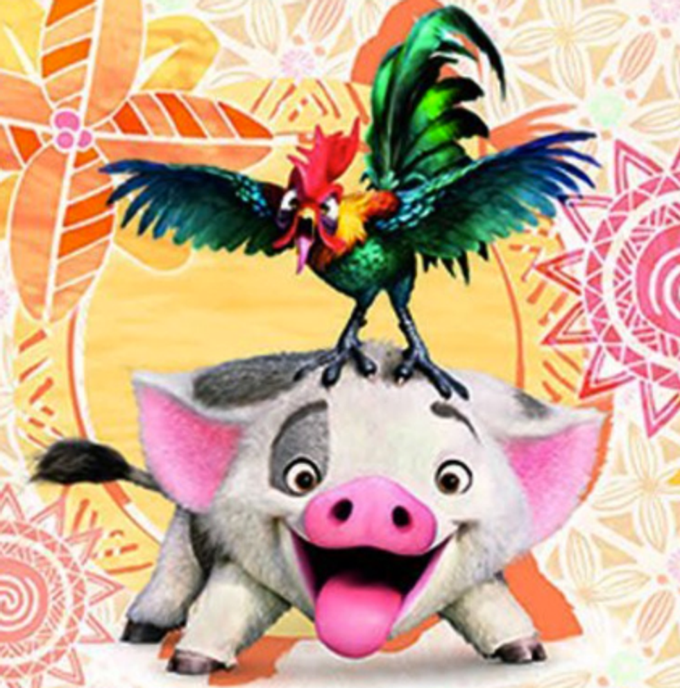 Moana and Maui are assisted on their journey by some other cute and quirky characters! Meet Pua the pig, and Heihei the rooster. They don't say very much, but they're super cute, and seem like the ultimate supportive friends—and that's really all you need!