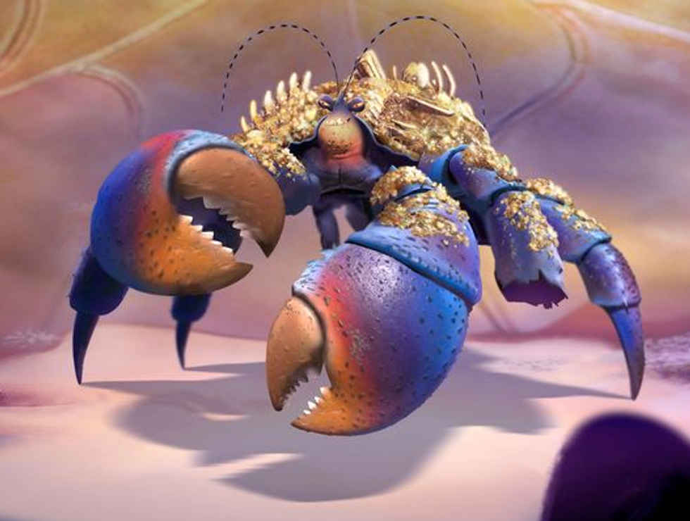 But wait, there's more! We are also introduced to a giant, 50 foot crustacean-thing named Tamatoa. He's conceited, selfish, desperate to rise above his station, and apparently has a real hankering for Maui's fish hook. Additionally, composer Lin-Manuel Miranda tweeted during his process of creating the music of "Moana" a few months ago, saying: