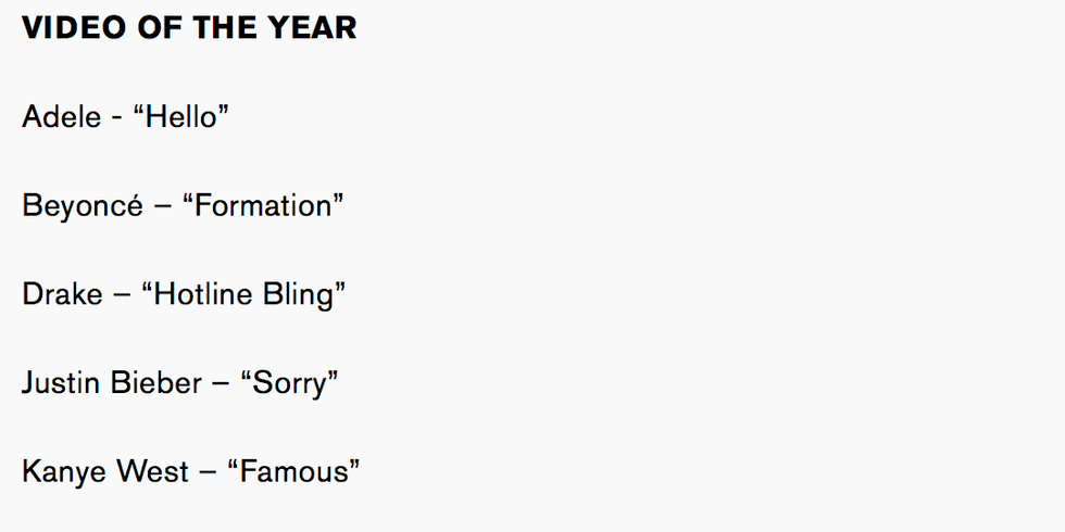 Recent winners of Video of The Year have been determine based on three criteria: controversy (Britney's "Piece of Me" in 2008), empowerment (Beyonce's "Single Ladies" in 2009), and how viral the video went (Miley's "Wrecking Ball" in 2014). Justin Bieber's "Sorry" accomplished none of the above, so it's safe to assume he will not be taking home this award. Kanye West's "Famous" was perhaps the most controversial song/video of the first half of 2016 for all the wrong reasons. Unfortunately for West, the Kanye vs Taylor vs Kim vs Chloe vs Khloe vs Selena vs Demi vs Ruby vs Katy feud overshadowed the actual video's release. The top three contenders this year are Beyoncé's "Formation," Adele's "Hello," and Drake's "Hotline Bling." All three songs received a generous amount of airplay and were major conversation topics during their release month. However, "Formation" suits today's growing conversation surrounding police brutality and the #BlackLivesMatter movement. It didn't go nearly as viral "Hotline Bling" or "Hello," but it is a definite fan-favorite and the most progressive video of the year.