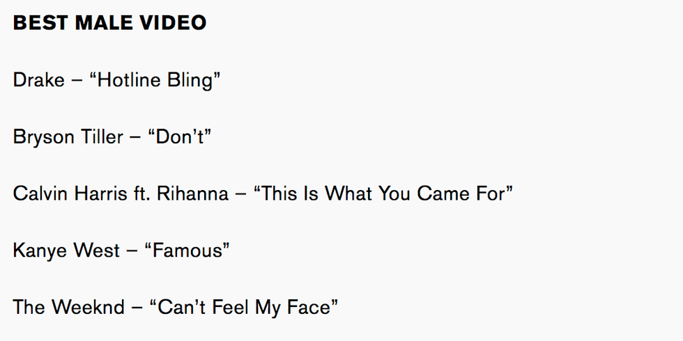 "This Is What You Came For" doesn't stand a chance. Although the video was quite striking, and America would watch Rihanna do anything, it's really hard for fans to consider this a Male Video. The Weeknd's "Can't Feel My Face" is just a little too old-news for fans to still throw awards at, and Bryson Tiller isn't quite mainstream enough to garner enough attention for "Don't" to win. That leaves our two biggest contenders: "Hotline Bling" and "Famous." "Hotline Bling" is the obvious winner in terms of commercial success, longevity, and cultural impact. However, MTV very may well stir the pot and give this one to West for pure shock value.