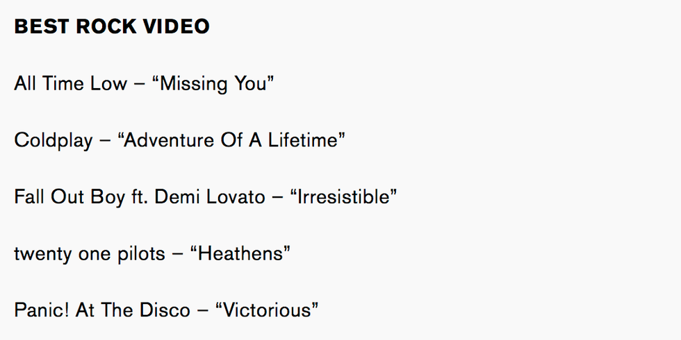 The Best Rock Video has typically been given based on popularity. First-time nominees All Time Low are probably honored to have just been nominated, but don't quite live up to their competition considering their fizzled fame and lack of airplay. Newly-mainstream duo twenty one pilots only stand a chance thanks to their young cult following and connections to the much-anticipated "Suicide Squad" film. However, Coldplay seems to be the front-runner given the critical praise of "Adventure Of A Lifetime" and the band's longstanding chart success.