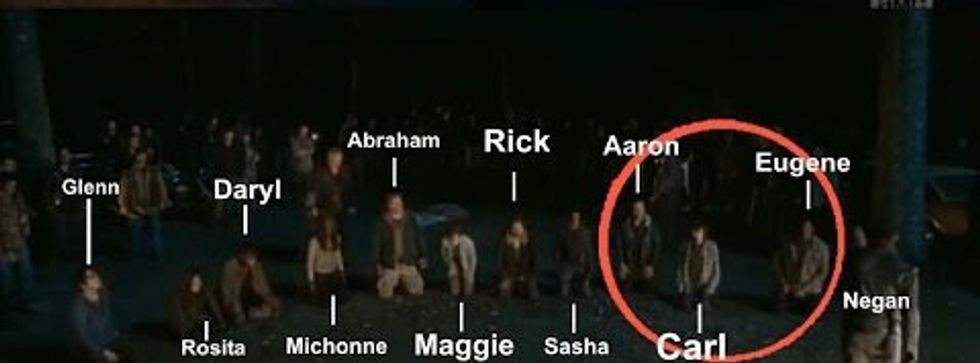 While referring to cutting Carl's other eye out, Negan slightly looks in the direction Carl is kneeling in. This seems to be a huge give away on where Negan is standing. Now we know that Carl is to the right of Negan which means we can eliminate Eugene automatically due to the fact the he is to the left of Carl and entirely opposite of Negan. We can also eliminate Carl as to Negan refers to him. He also refers to Rick meaning Rick is safe as well. This leaves 8 people.