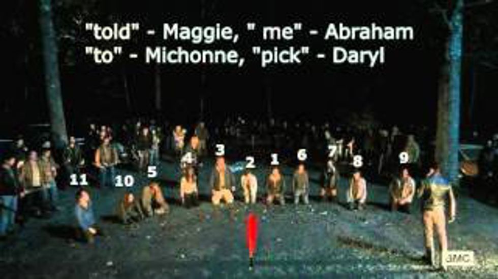 Rick "eenie" > Maggie "meanie" > Abraham "miny" > Machonne "moe" > Daryl "catch" > Sasha "a tiger" > Aaron "by" > Carl "his toe" > Eugene "if" > Rosita "he hollers" > Glenn "let him go" > Rick "my mother" > Maggie "told " > Abraham "me" > Michonne "to" > Daryl "pick" > Sasha "the very" > Aaron "best" > Carl "one" > Eugene "and you" > Rosita "are" > Glenn "it"