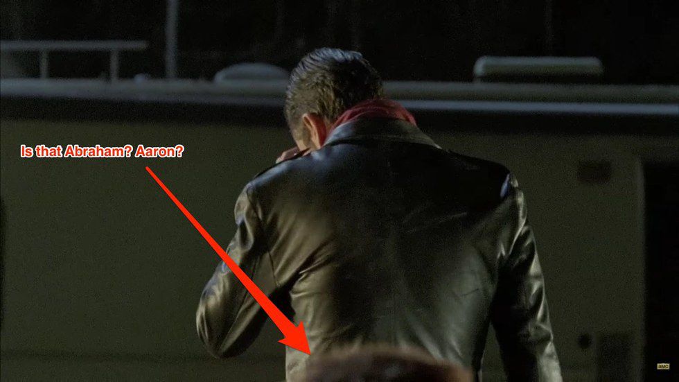 Now if you pay attention to when Negan begins beating that person pause your TV, DVD, DVR ect. and look closely. you can actually see in the background where specifically Negan is standing. If you did notice to the right there will be a fuzzy image of someone but this person looks to be one of the girls. Now we know for a fact that Maggie was safe, Abraham is next to Maggie which could validate the theory it was him. This specific idea actually rules out Rosita, seeing as there's a woman next to who ever our victim may be.