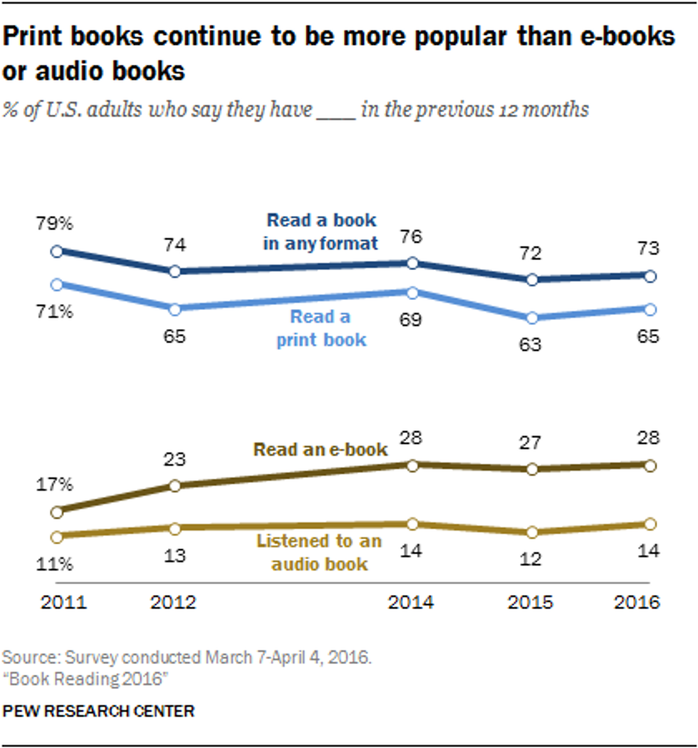 But all in all, those who have been scared for the publishing industry going out of business can relax a little. According to Pew, "The share of Americans who have read a book in the last year is largely unchanged since 2012; more Americans read print books than either read e-books or listen to audio books."
