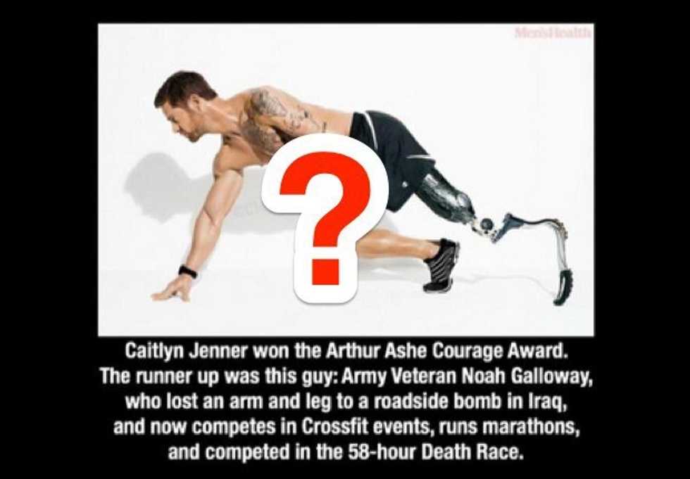 The caption of the photo read that Caitlyn Jenner was receiving the Arthur Ashe Courage Award (given by ESPN) while the picture was of Army Veteran Noah Galloway, who had lost an arm and a leg in a roadside bomb. Not only did Galloway risk his life for our country, he came back without two limbs and has completed multiple crossfit events, marathons, and the 58-hour Death Race Challenge.