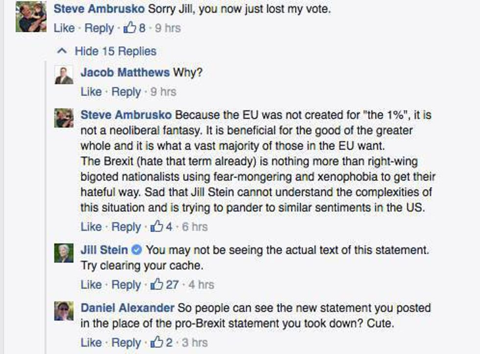 Her campaign has had its struggles with integrity, as well. Stein initially agreed with Trump that Brexit was a good idea, a way for Britain to “take back their country” with “self-determination” (too bad the pound dropped faster than my GPA once the results of the referendum were announced). But, once Stein publicly declared her support for Brexit, she immediately changed her mind once people called her out on it. And, then she tampers with her webpage and told people to clear their cache so that they couldn’t see the original post… Hmmm…
