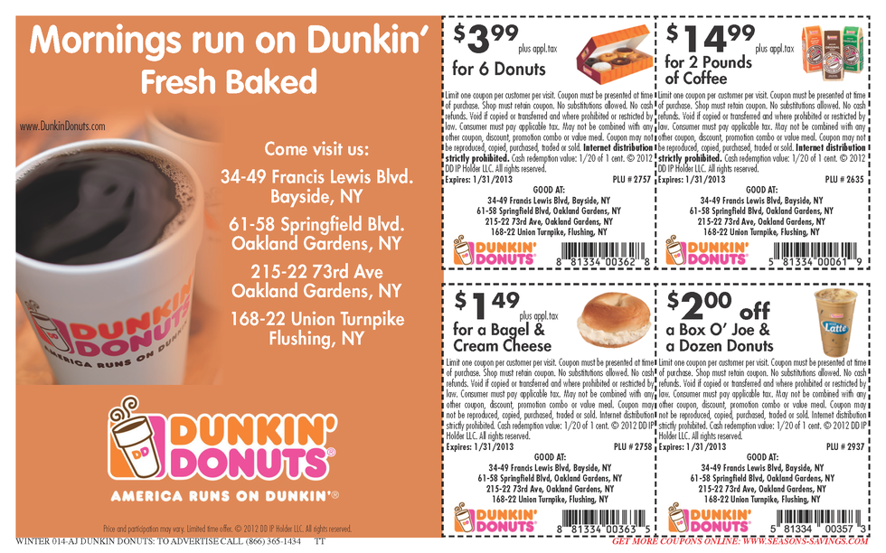 The deals are unbeatable! Dunkin' Donuts mails out coupon books to your house and on their DDPerks app, multiple discounts are offered to members every day! Another fun offer is during football season. If the NY Jets or NY Giants win, customers can come in the next day and get a coffee for 25 cents! When has Starbucks ever done anything like that?