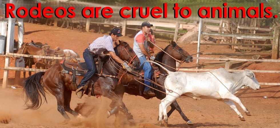 Rodeos? I bet you are thinking "There's no way rodeos are still are" Well turns out they are. But for those who aren't sure what a rodeo is, it's a an exhibition match which cowboys show their skill at riding broncos, roping calves, wrestling steers and whatever other barnyard animal. Rodeos are popular in the western United States and is the official state sport of Wyoming, South Dakota, and Texas. Here's something you may not know, The animals who participate actually undergo physical harm and trauma, And unfortunately the audience who decides to spectates doesn't see the animals suffering. Allow me to explain.