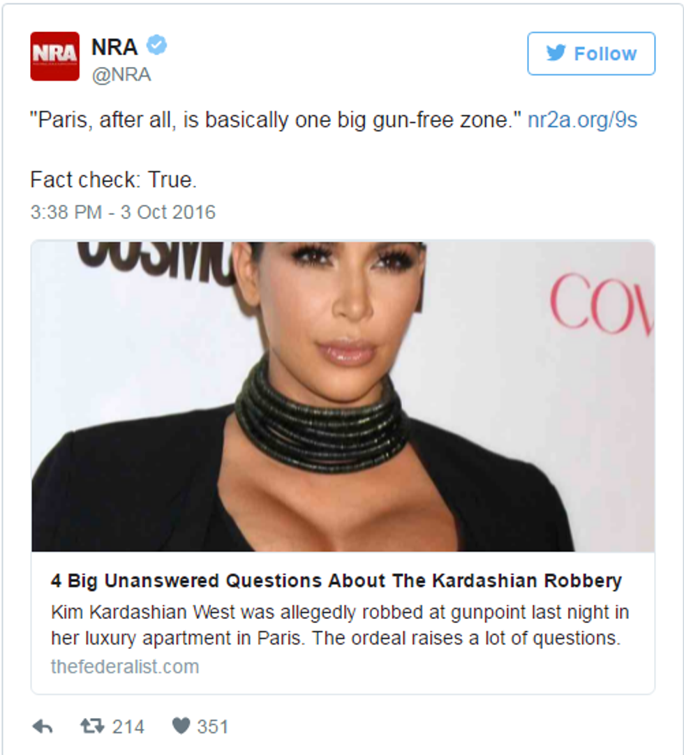 The National Rifle Association has felt the need to use this traumatizing event in someone else's life as an agenda to promote less gun legislation and mock those who support gun control. While the NRA weighs in on the event, many notable news sources have been attacking Kardashian-West for this event happening: some even claiming that this is all a hoax in order to get some attention.