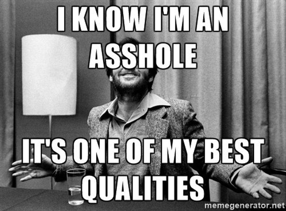 Sure, everyone has had a bad day where maybe they were being a bitch. But if you are one of these self-proclaimed assholes who feel the need to expose their character through a Facebook meme, I feel sorry for you. Being nice to people is an incredibly rewarding feeling, and who doesn't like when someone is nice to them? How can you expect someone to be nice to you when you're essentially walking around with a sticker on your forehead that says "I will not be nice"?