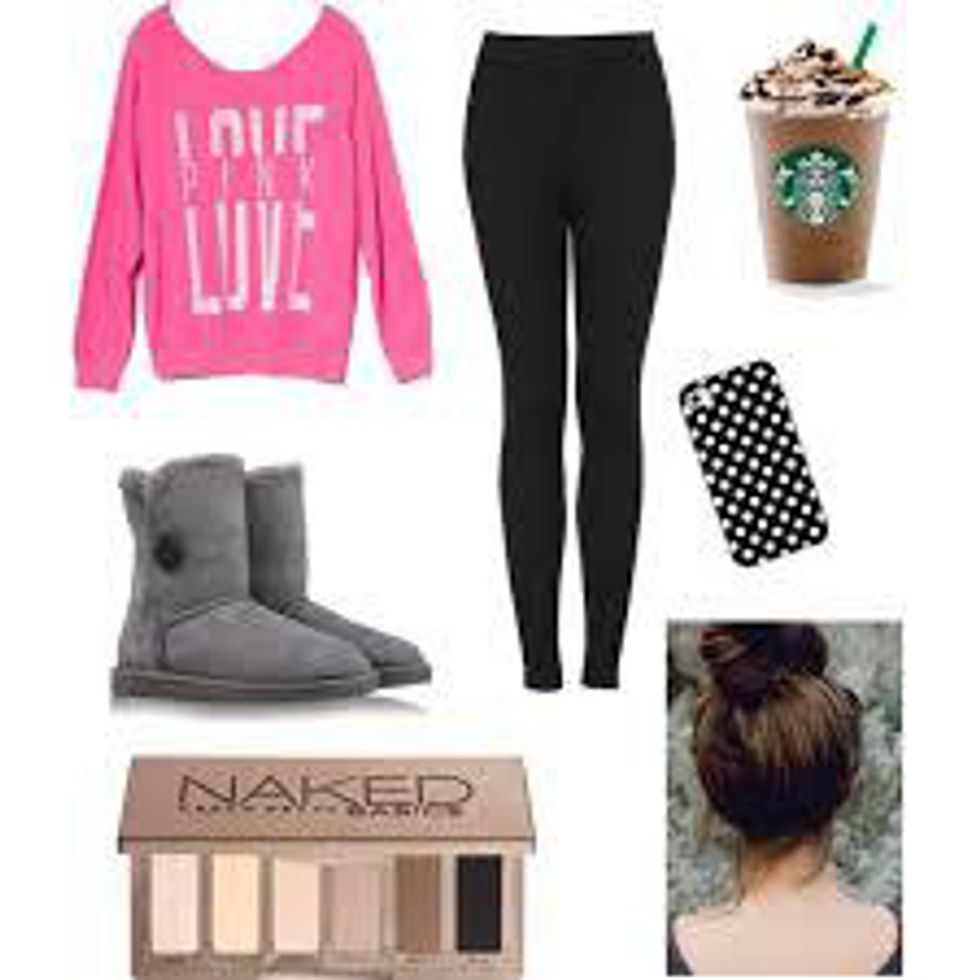 Most of the items featured are name brand products that include a Victoria's Secret shirt, Ugg brand boots, a Starbucks frappucino, an iPhone, and a Naked make-up palette.