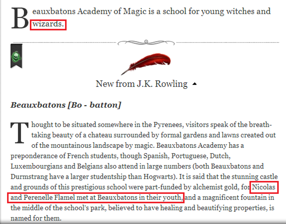 Want more proof? According to Pottermore, Durmstrang was founded by a woman and Nicolas Flamel attended Beauxbatons. Granted these are outdated screenshots from the days when you had to do activities to unlock this information on Pottermore, but the information is still true.