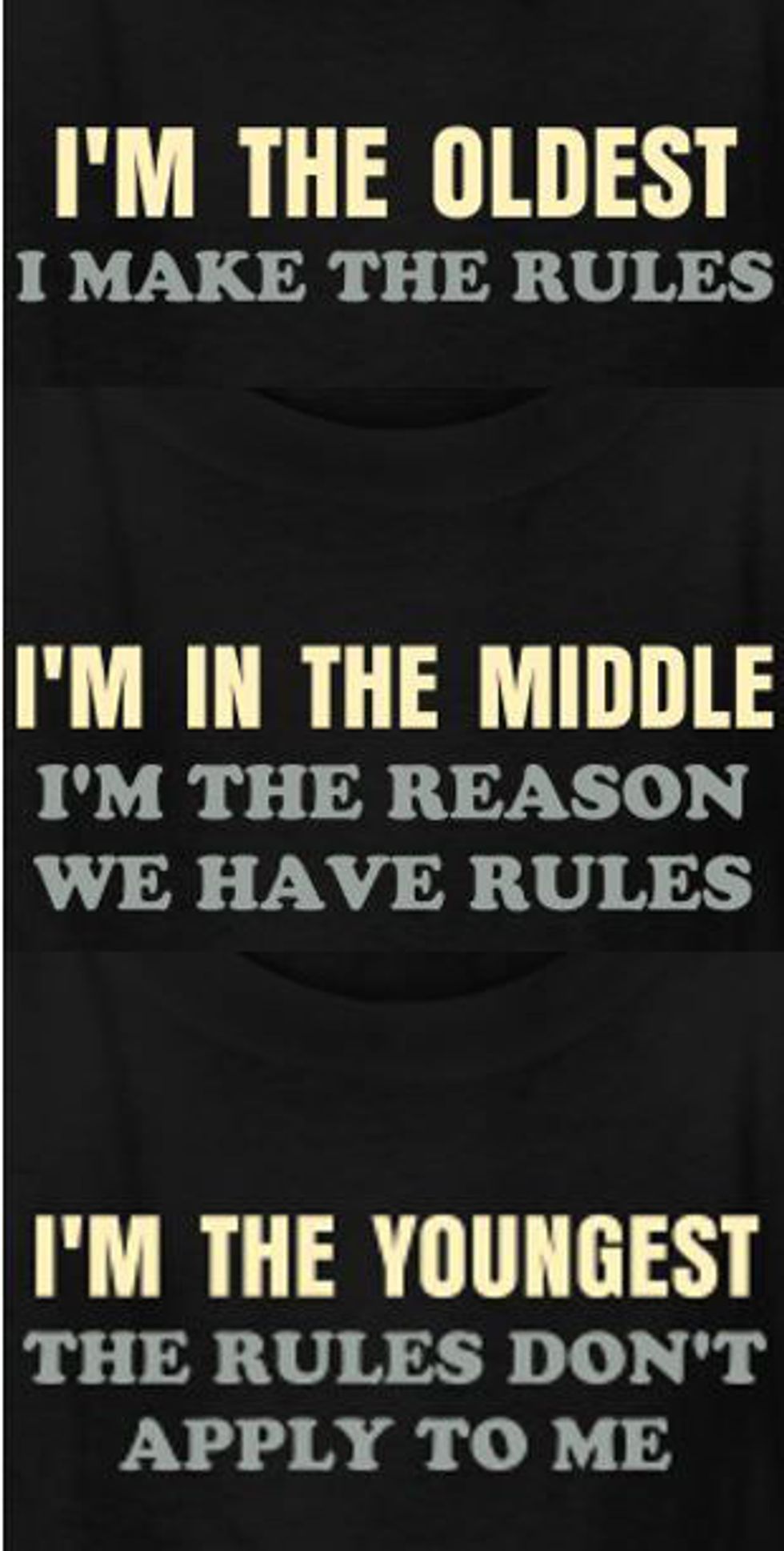 If your parents want to try anything it is on the older siblings. If they want to try a chore chart or a curfew your oldest siblings are the one to try it out. Thank goodness.